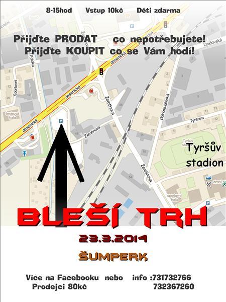 Komentář: Trhy pro všechny – přijďte prodat přebytky ze svých šatníků,šupliků, půd, sklepů i garáží. Věci, které Vám doma již dosloužily, zabírají místo, ale je vám líto je vyhodit, můžete na bleším trhu výhodně zpeněžit.To, co nakoupíte na bleším trhu, nenajdete v žádném supermarketu! vice na facebooku