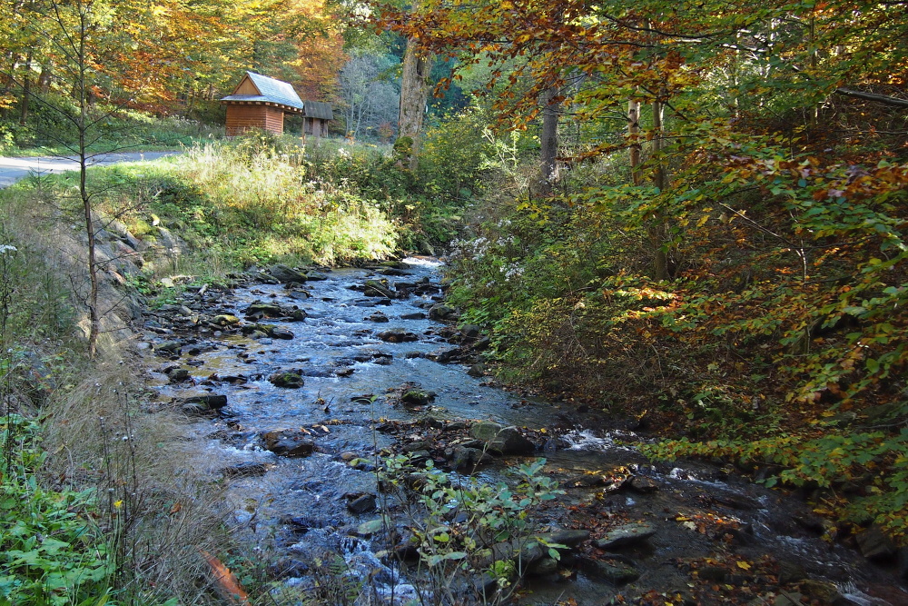 Komentář: Říčka Merta u rozcestí Pod Zadním hutniskem. Ještě předloni na této křižovatce lesních cest nebylo nic mimo rozcestníku a informační cedule, teď nově přibyla dřevěná útulna.