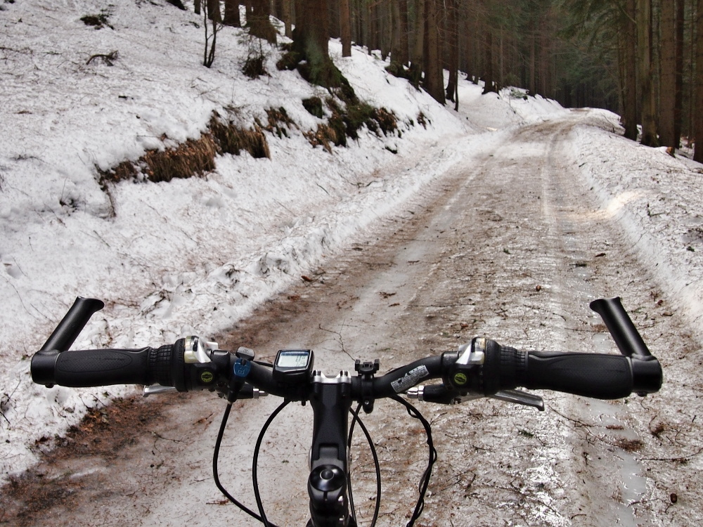 Už pod 600 m jsou taková místa, kdy je třeba bílý svah lesa, ale cesta ještě celkem v pohodě. Od zhruba 750-800 m už je bílo i na silnici. Někde led, někde sníh, ale nejhorší je led, po kterém teče voda. Tam je masakr i jít pěšky, natož s kolem, jak to klouže. Z Boudy na Čečel jsem šel prakticky po svých ve sněhu. Trochu jsem přehnal to nadšení z prvního jarního dne. Potkal jsem dalšího takového šílence, který to bral od Vysokého Potoka a situace prý stejná. Takže na kopečky zatím ještě ne.
