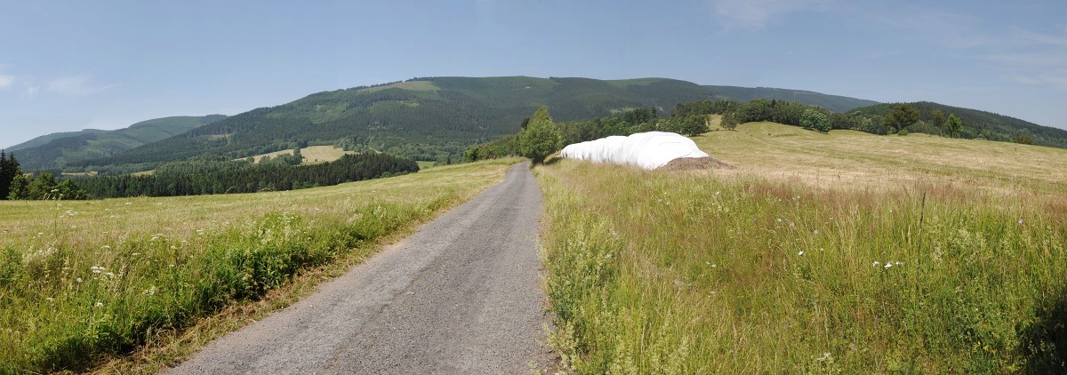 Komentář: Rozcestí poblíž Hynčic pod Sušinou ze zelené turistické trasy od St.Města. Neznačená cesta odbočující do Hynčic asi bývá přehrazena ohradníkem, ale ten byl v sobotu přestžižený, takže se dalo volně projít.