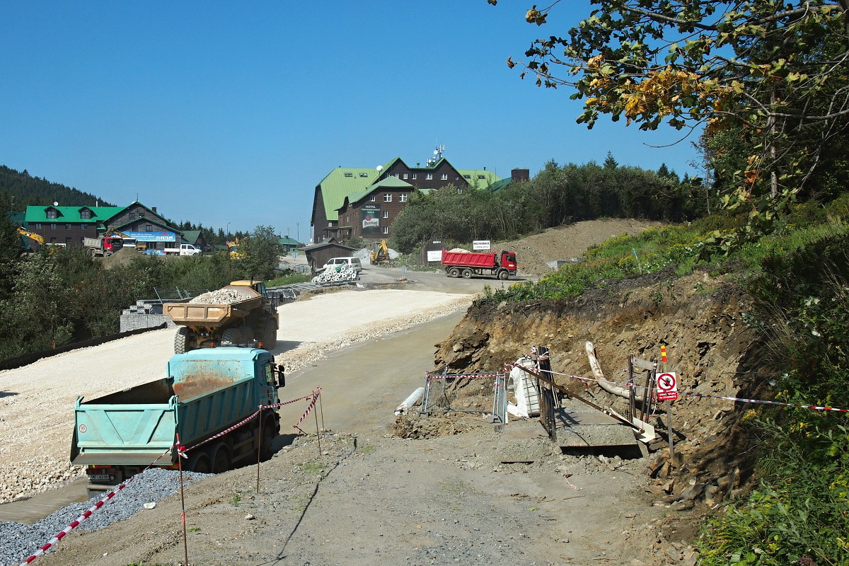 Komentář: Aktuální foto z prací na Červenohorském sedle. Opatrně jsem projel na druhou stranu silnice a nikdo nic neřekl. Avizovaná omezení u Švýcárny zatím nejsou a minimálně v úseku Švýcárna-Petrovka je vše při starém.