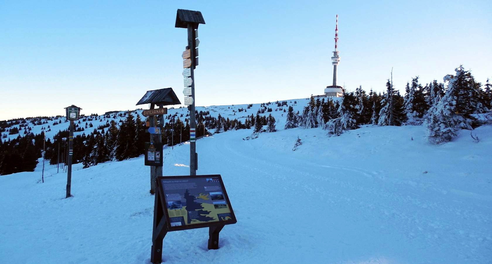 Komentář: Pohled na Praděd a vysílač.... \r\n\r\nPraděd (německy Altvater; polsky Pradziad) je 1491,3 m vysoká hora v Hrubém Jeseníku, nejvyšší vrchol tohoto pohoří. Je to zároveň nejvyšší hora Moravy, Českého Slezska i Horního Slezska vůbec. Celkově jde o pátou nejvyšší horu Česka,[2] také druhou nejprominentnější a třetí nejizolovanější. Je zde nejdrsnější podnebí, průměrná roční teplota nepřevyšuje 1 °C. Na slezské části vrcholu stojí 146,5 metrů (do roku 1993 měl 162 m) vysoký televizní vysílač s rozhlednou, jehož horní plošina je nejvyšším (byť umělým) bodem v ČR.\r\n\r\nVrchol hory leží ve Slezsku, pod ním probíhá historická zemská hranice Moravy a Slezska, v současnosti tudy prochází i hranice krajů Moravskoslezského a Olomouckého, a okresů Bruntál (Malá Morávka, Vrbno pod Pradědem) a Šumperk (Loučná nad Desnou).\r\n\r\nNa severním úbočí vrcholu je rozsáhlý mrazový srub Tabulové skály s unikátní květenou.