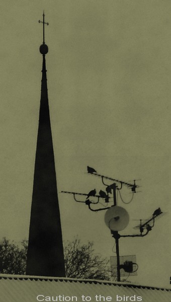 ..hmmm asi pět holubů, nějakej internet nebo co,TV,věžička s křížem,tož nevím..že by věž u pátero holubů???