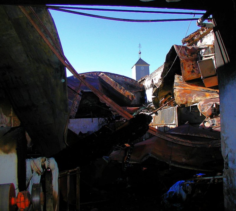 Nechtěl bych se mýlit... ale ne, je to bordel po požáru. žárem zdeformovaný nějaký nosníky, halda plechů asi ze střechy. nějaká dílna nebo sklad, kde mělo co hořet. ale kde to je netuším.