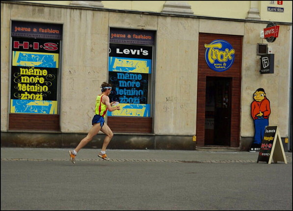 Neříkám, že je to dobrá fotka, pouze mě zaujal sprint Itala Marca Seppiho do tohoto obchodu... A také, že v tom městě plném lidí se dal vyfotiti na hlavní třídě osamocený běžec...